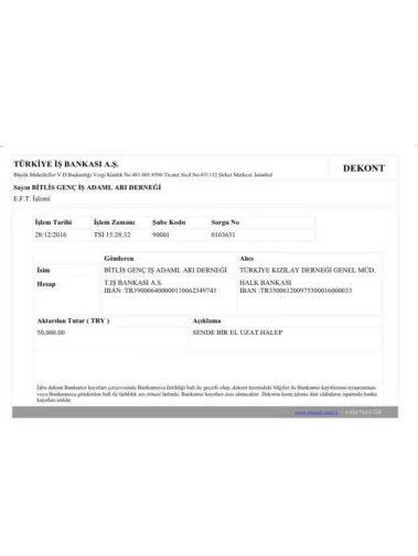 Bitlis Girişimci İş İnsanları Derneği olarak Halep’ e Bir elde sen uzat kampanyasında Türk Kızılayına Vermiş Olduğumuz Destek`den Dolayı Türk Kızılay`ı İstanbul İl Şube Başkanı Sn İlhami Yıldırım veTürk Kızılay Kadın Kolları Başkanı Sn Zerrin Menteşoğlundan Derneğimize Teşekkür Belgesini hava şartlarından dolayı Ankara`dan gelemeyen BİGİAD Genel Başkanımız Sn:M.ZEKİ PEKER ve Yönetim Kurulu adına Üyemiz Birol Kutas ve Koordinatör Sevil Elibolca Teslim Aldı. Halepe Bir Elde Sen Uzat Kampanyasina Destek Olan Herkeze Teşekkür Eder.Bizlerde Bigiad Ailesi Olarak Yaptıkları Hizmetten Dolayı Türk Kızılay`ı na Teşekkürlerimizi Sunarız ..